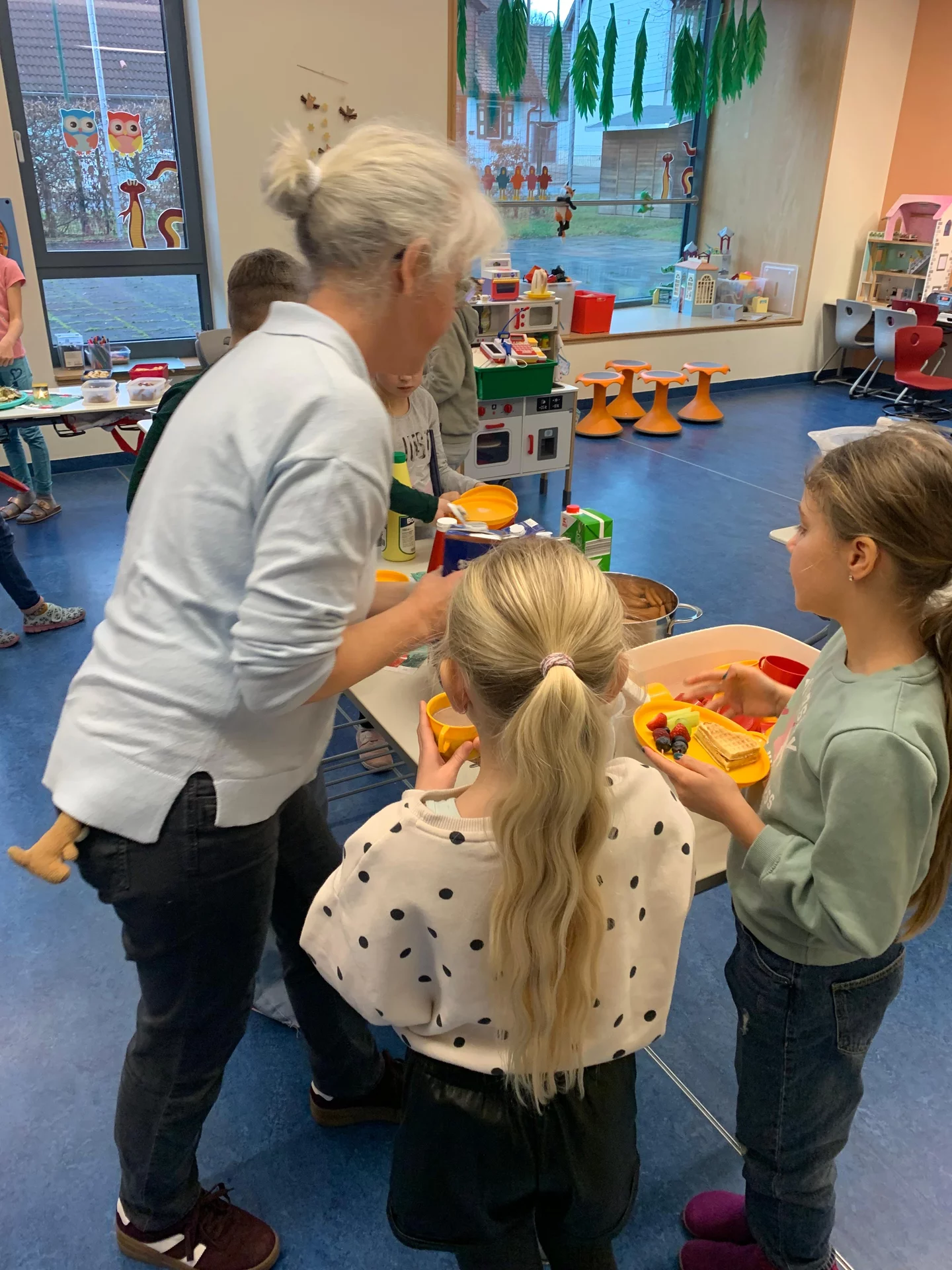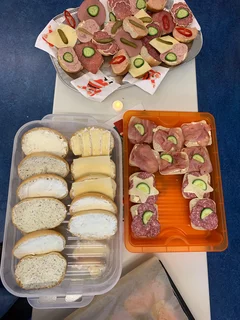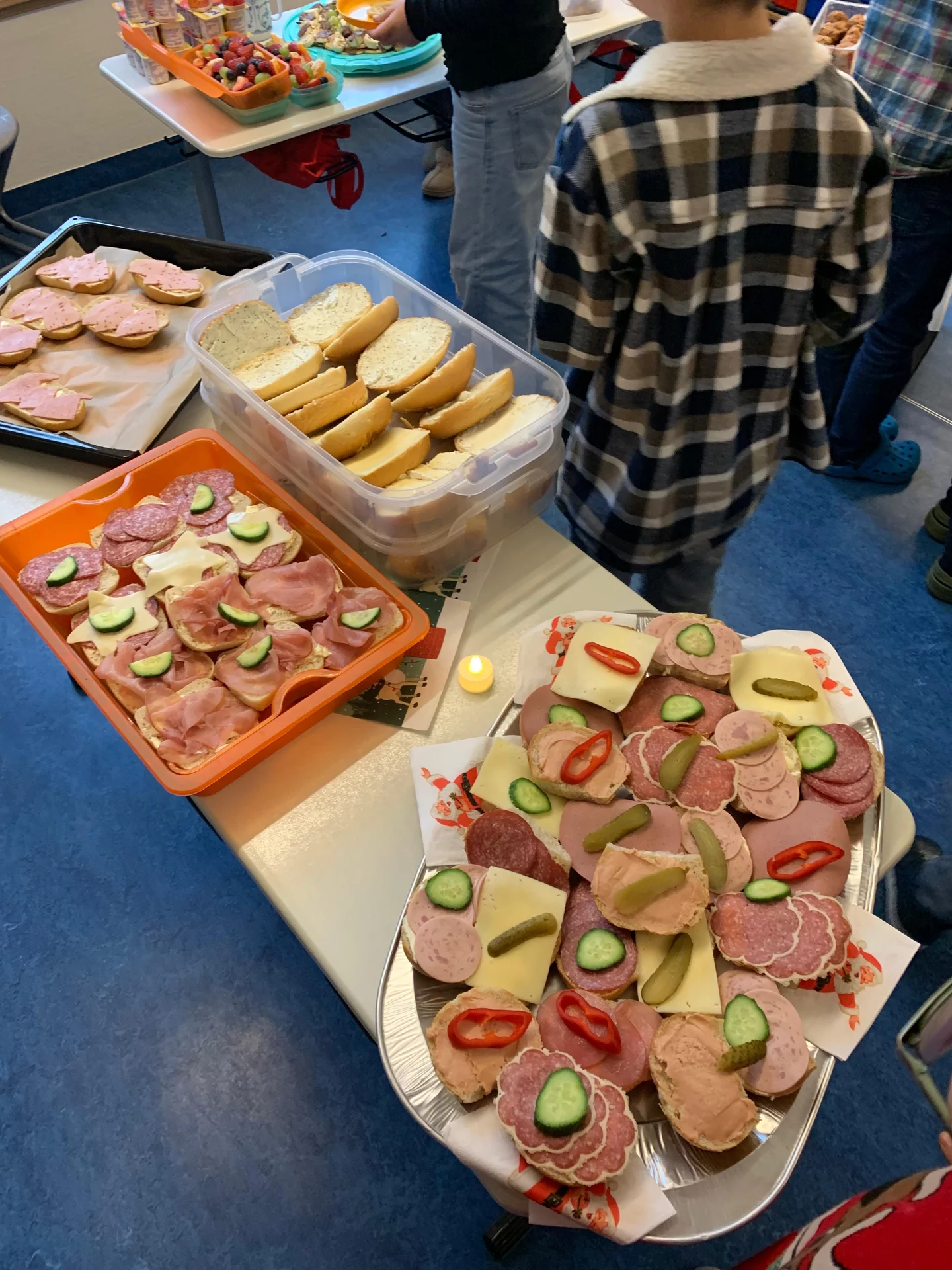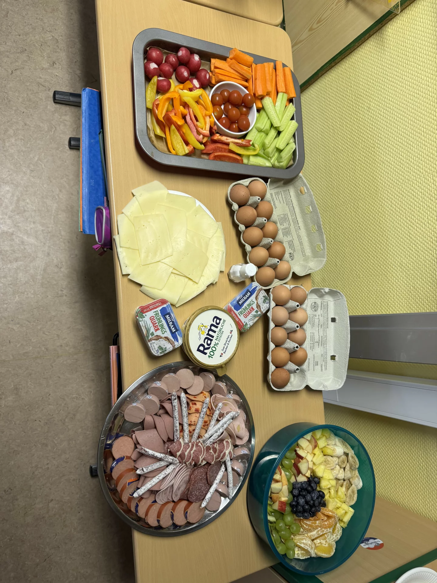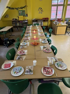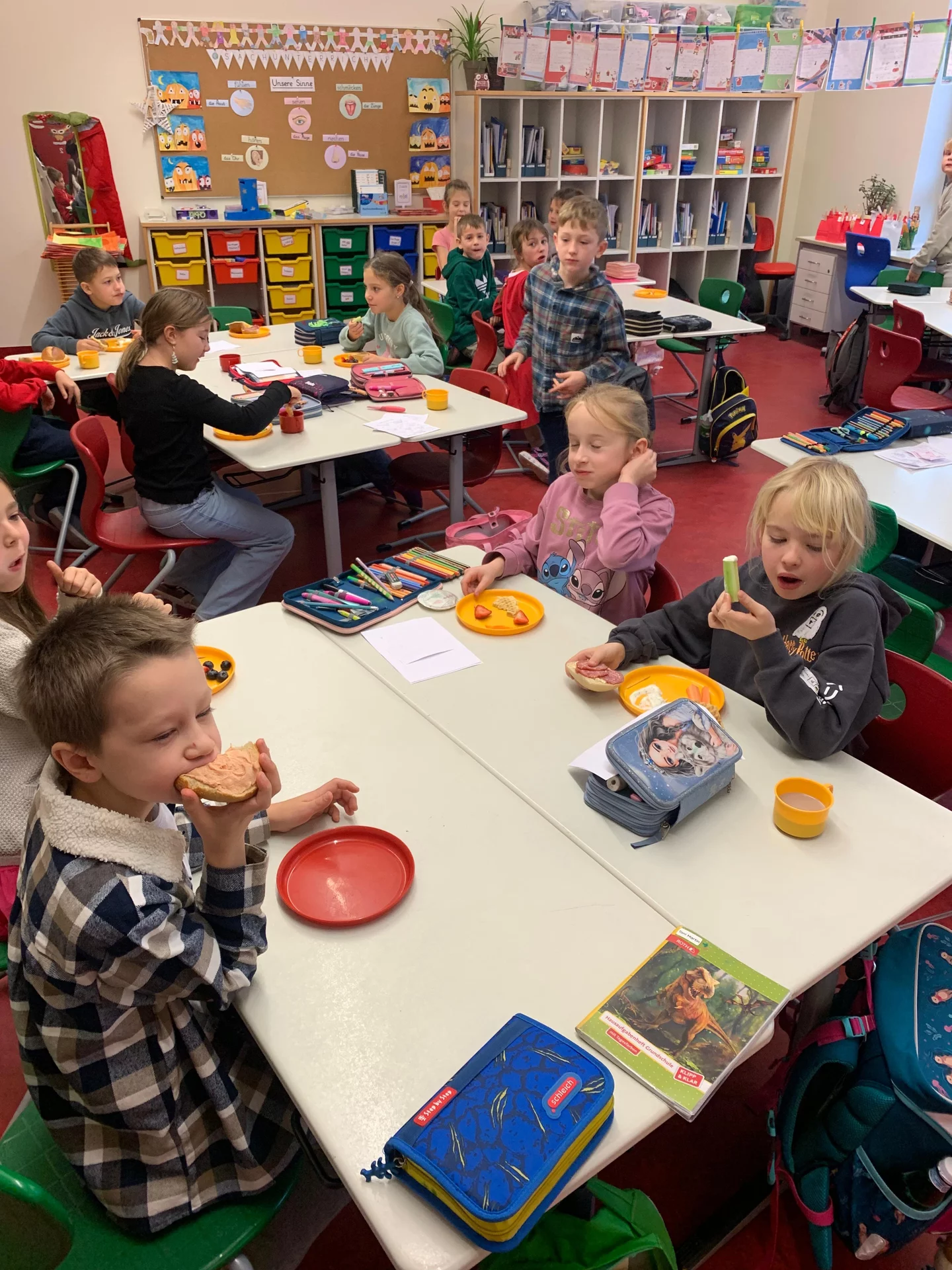 Zurück im Klassenraum wartete bereits ein gemeinsames Frühstück. Die Eltern hatten ein wunderbares Buffet gezaubert, das wirklich keine Wünsche offenließ: Kakao, frisch gebackene Muffins, eine tolle Obstplatte, Wurst- und Käseplatten, viel Gemüse, leckere Aufstriche, gekochte Eier und vieles, vieles mehr. Ein herzliches Dankeschön an die Eltern für diese großartige Unterstützung und das liebevoll vorbereitete Frühstück.