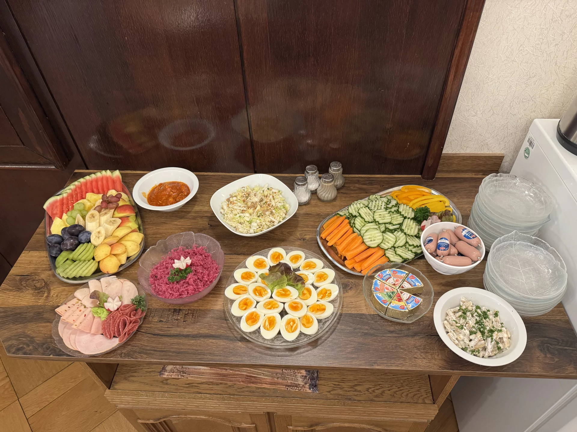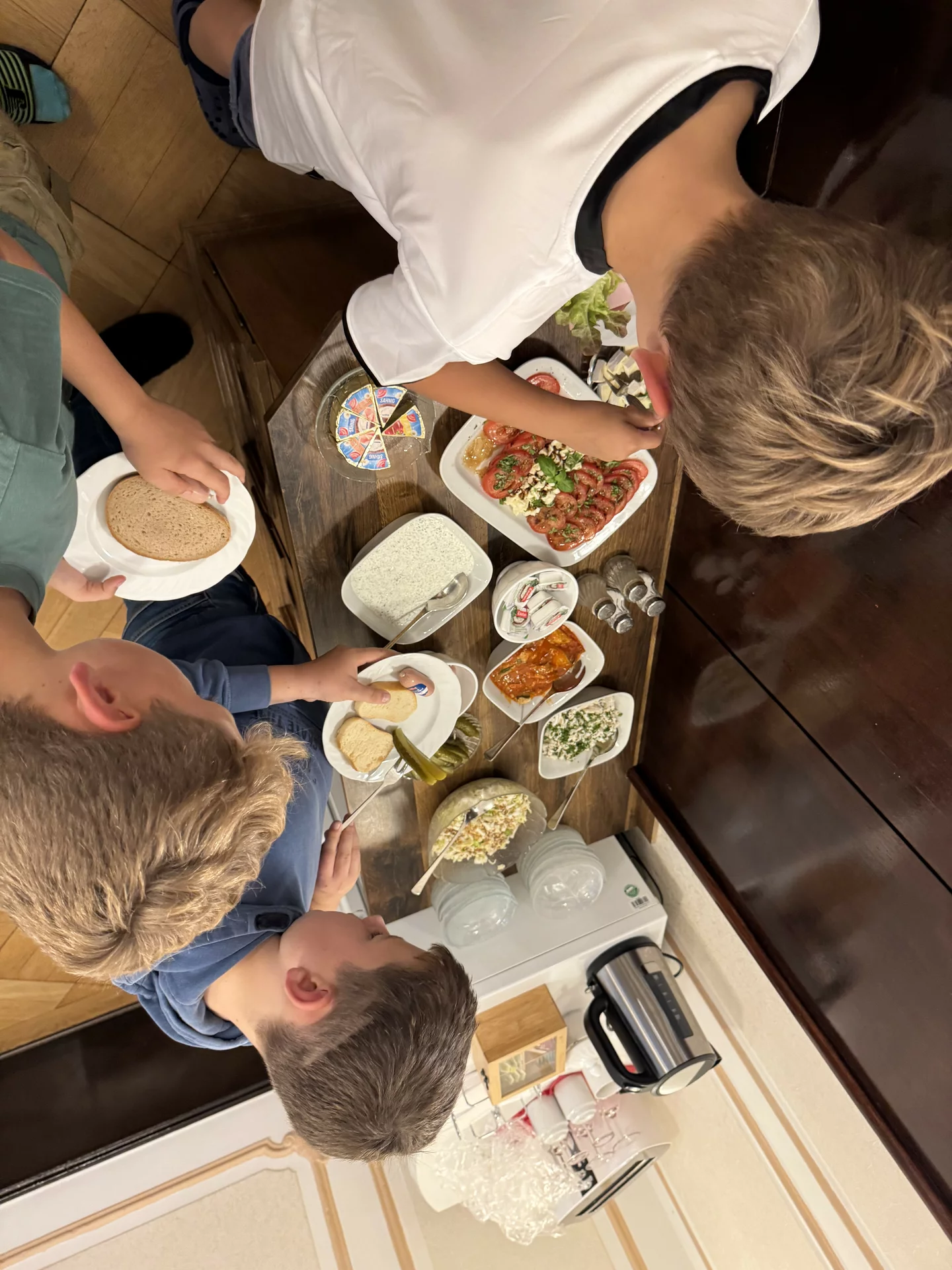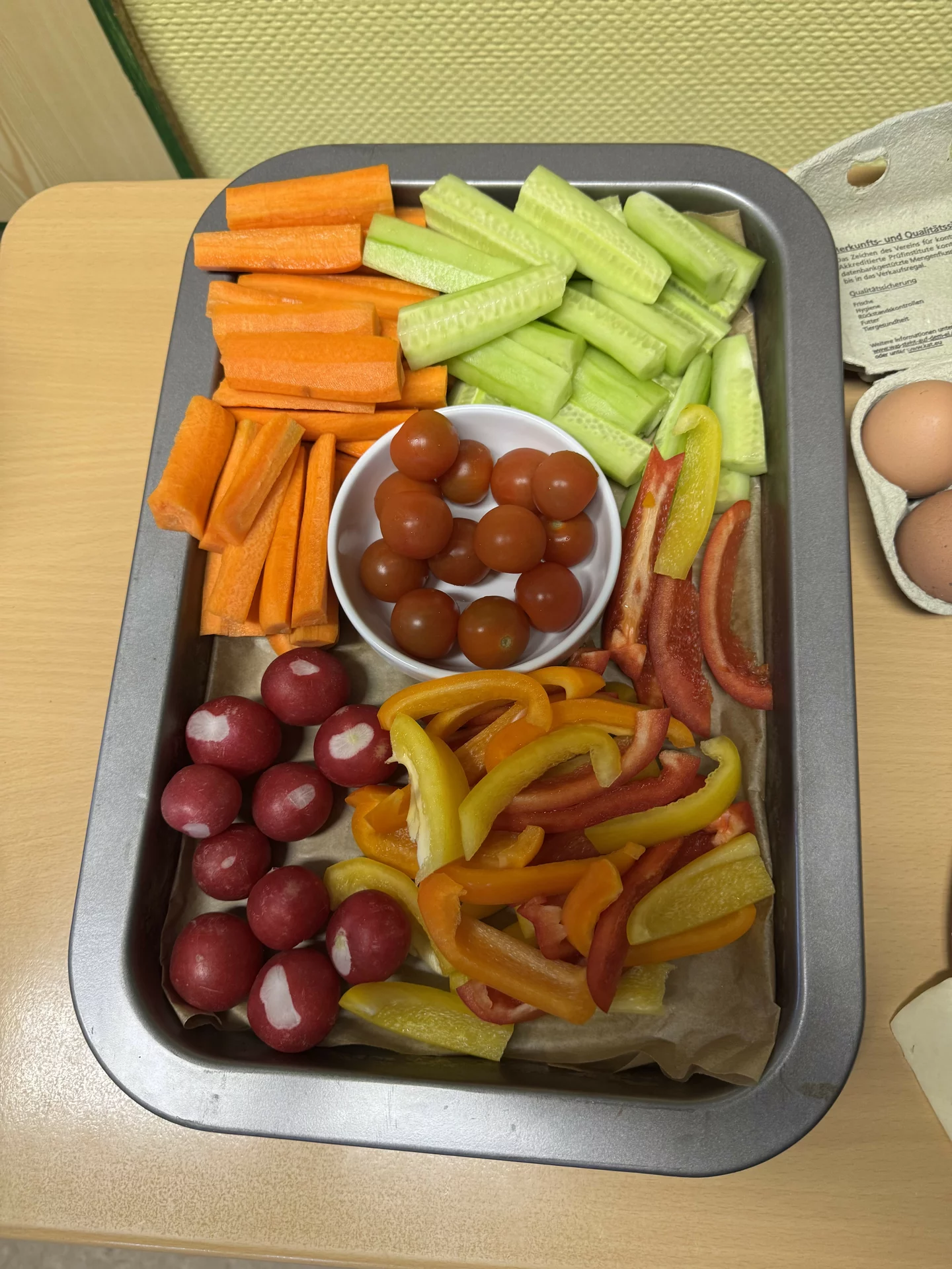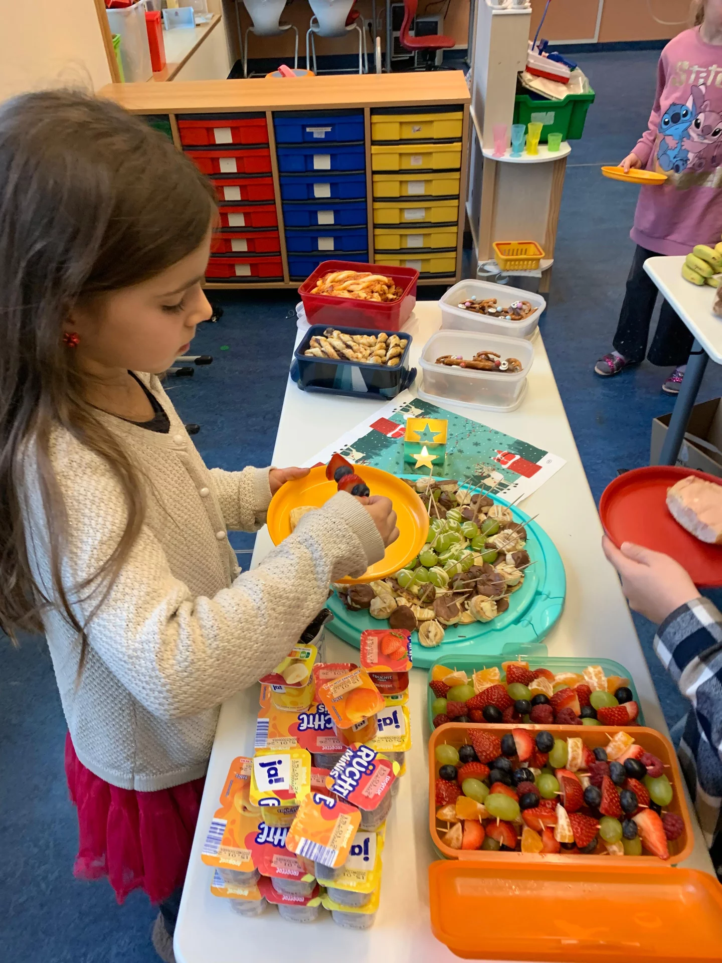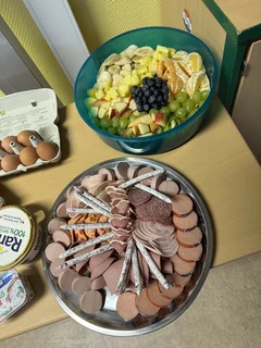 Zurück im Klassenraum wartete bereits ein gemeinsames Frühstück. Die Eltern hatten ein wunderbares Buffet gezaubert, das wirklich keine Wünsche offenließ: Kakao, frisch gebackene Muffins, eine tolle Obstplatte, Wurst- und Käseplatten, viel Gemüse, leckere Aufstriche, gekochte Eier und vieles, vieles mehr. Ein herzliches Dankeschön an die Eltern für diese großartige Unterstützung und das liebevoll vorbereitete Frühstück.