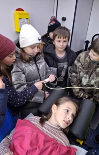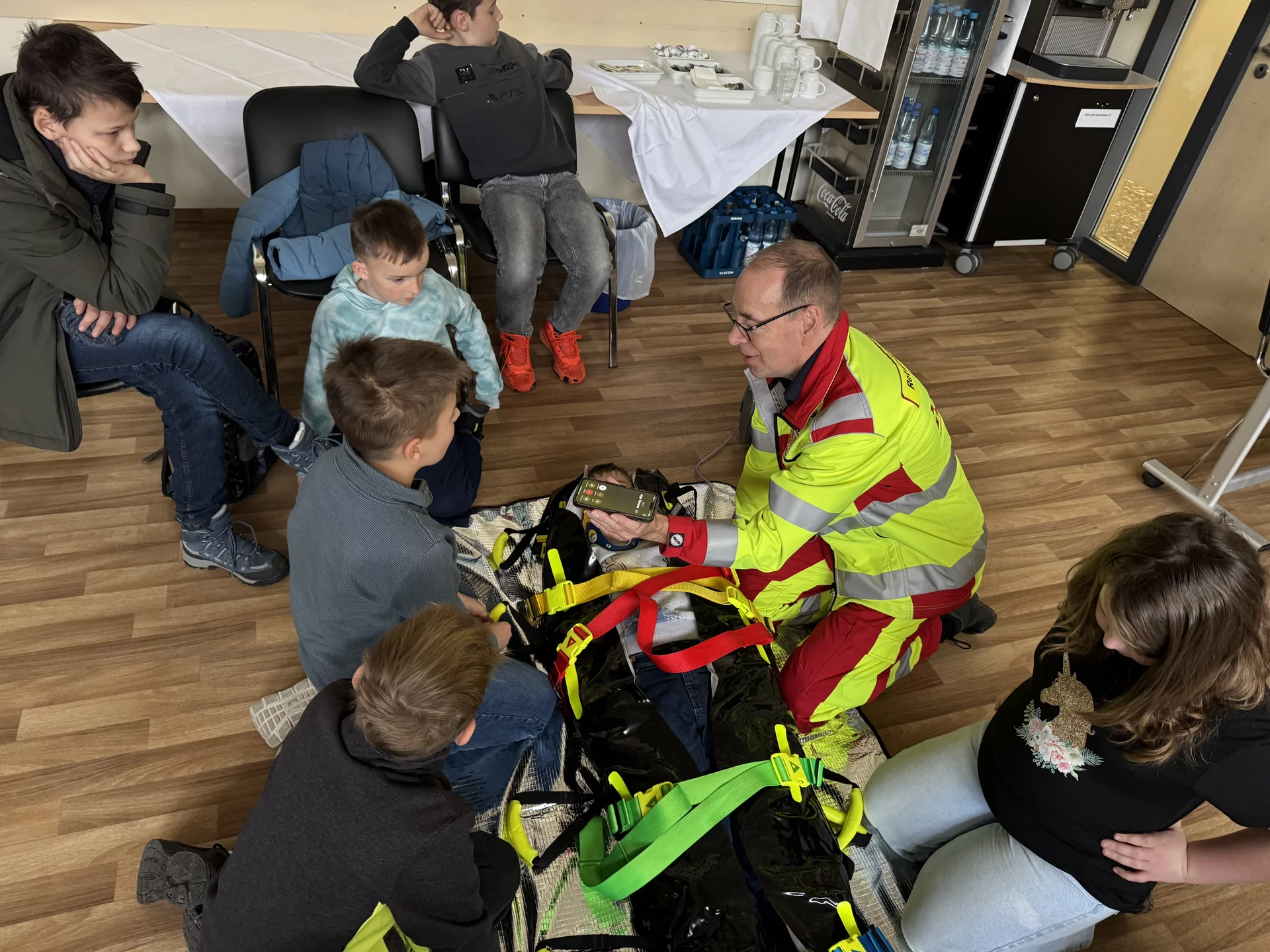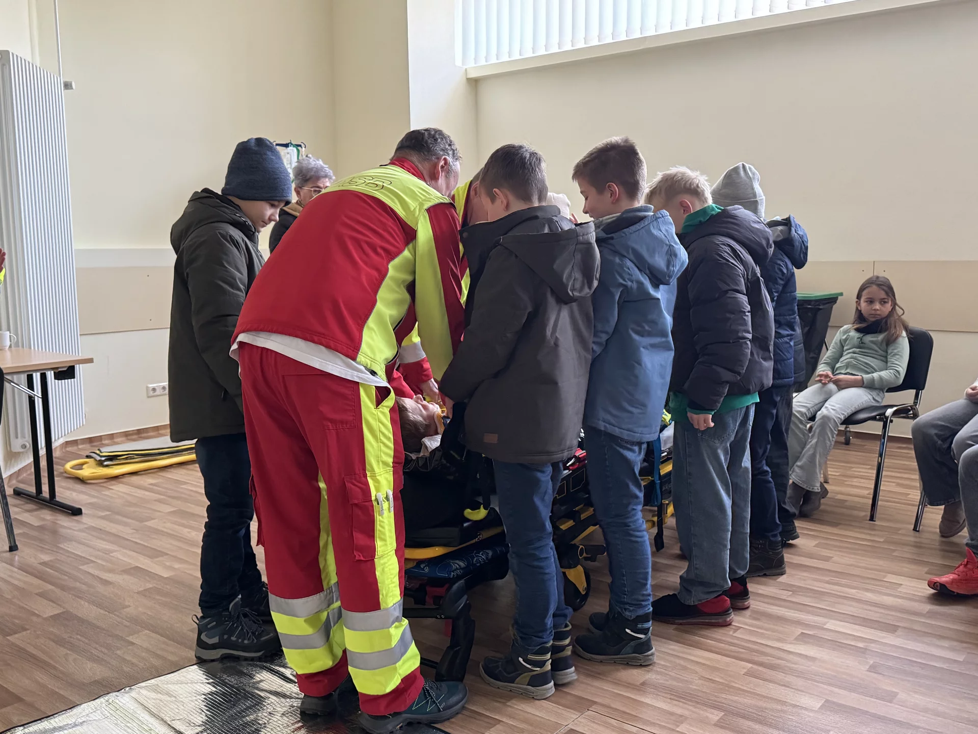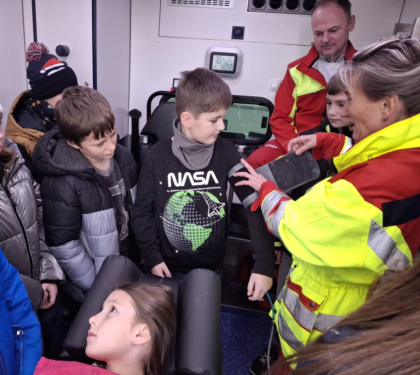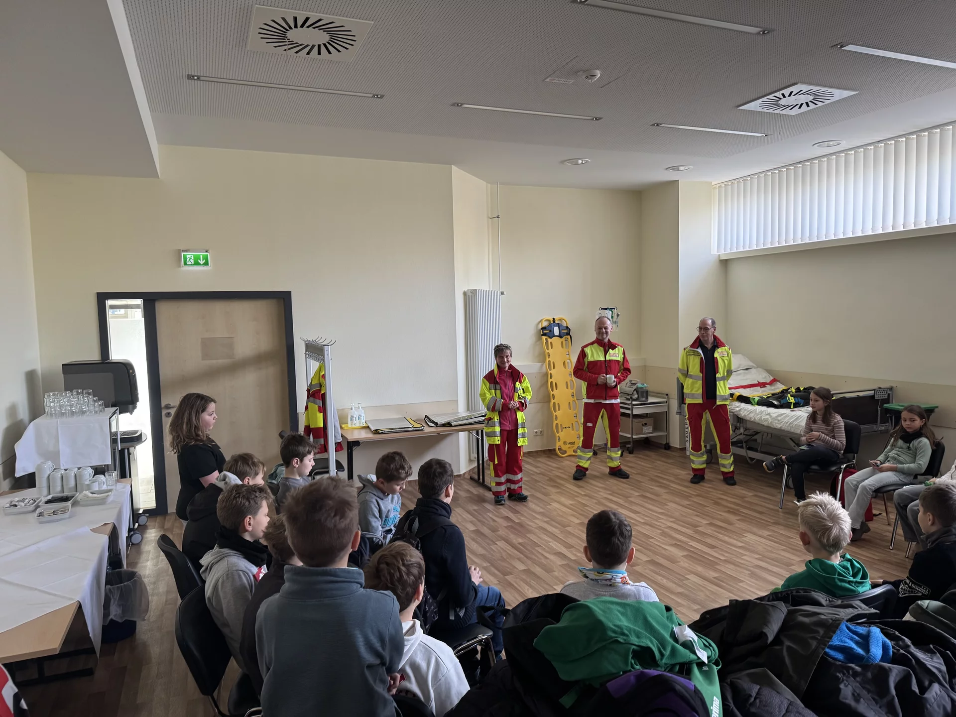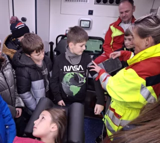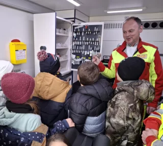 Schon beim Betreten des Geländes war die Vorfreude groß, denn die Kinder durften einen echten Rettungswagen von innen erkunden. Die Notfallsanitäter erklärten alles sehr geduldig und anschaulich: Wie ist ein Rettungswagen aufgebaut? Welche Geräte gibt es? Wofür werden sie eingesetzt? Einige mutige Schülerinnen und Schüler durften sogar Patient spielen. Bei ihnen wurden Puls, Sauerstoffsättigung und Blutdruck gemessen – natürlich alles ganz real, aber unter sicherer Anleitung. Auch ein kleiner Krankentransport wurde durchgeführt, sodass die Kinder hautnah erleben konnten, wie ein Notfalleinsatz abläuft. Die Sanitäter beantworteten jede Frage freundlich und ausführlich. Für alle war es lehrreich, spannend und sehr interessant.