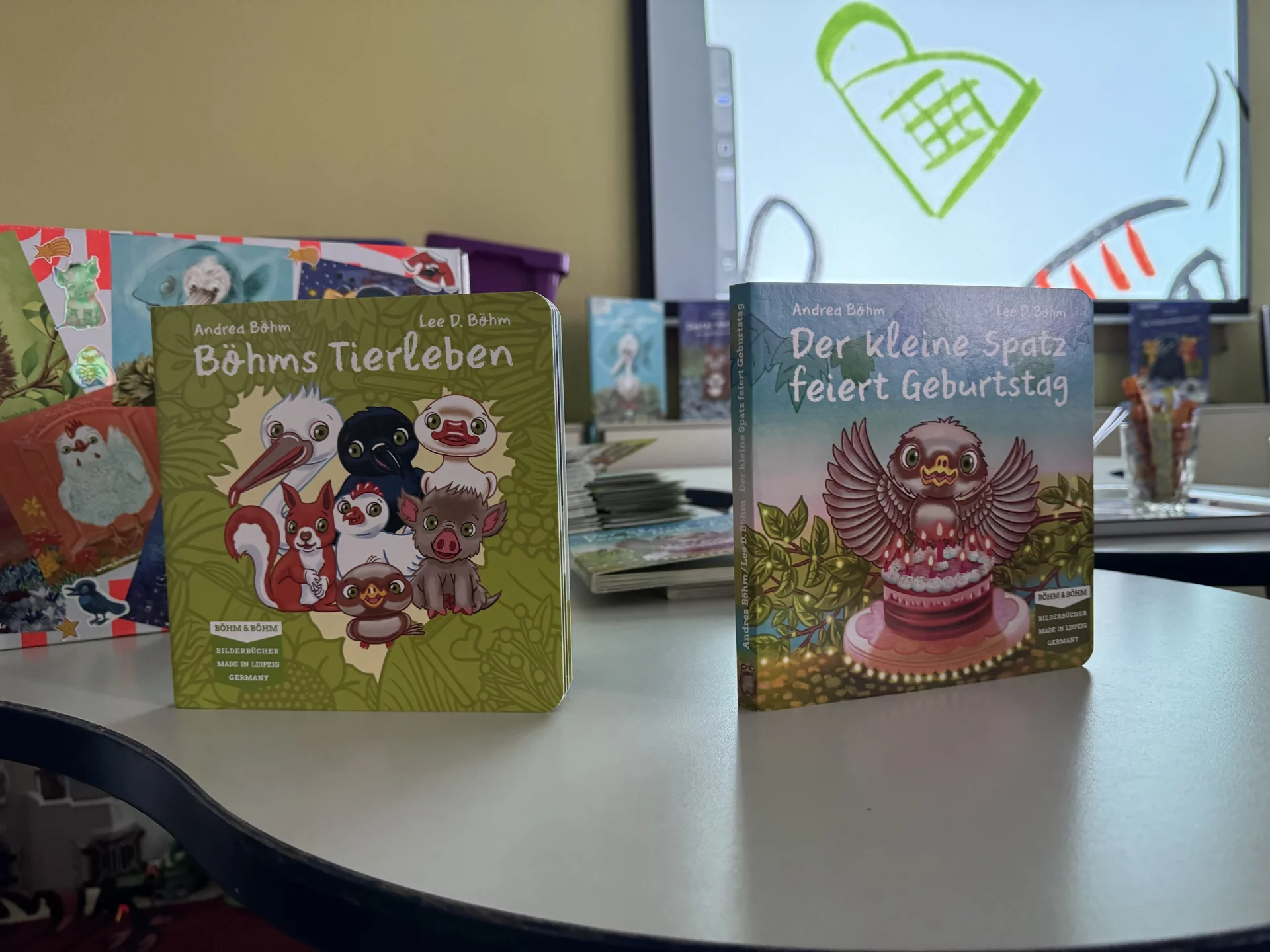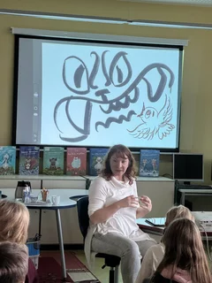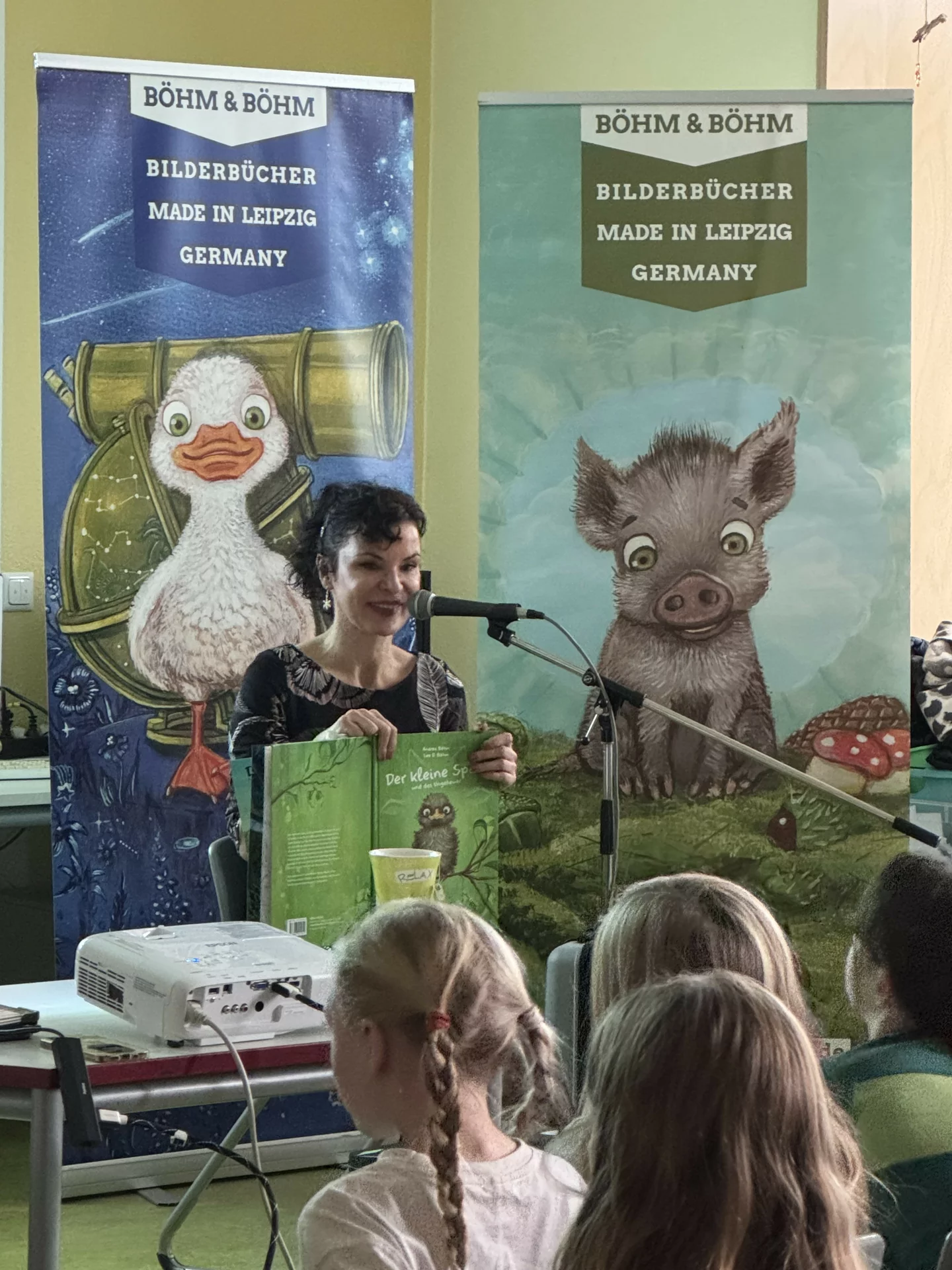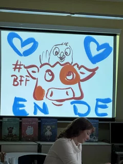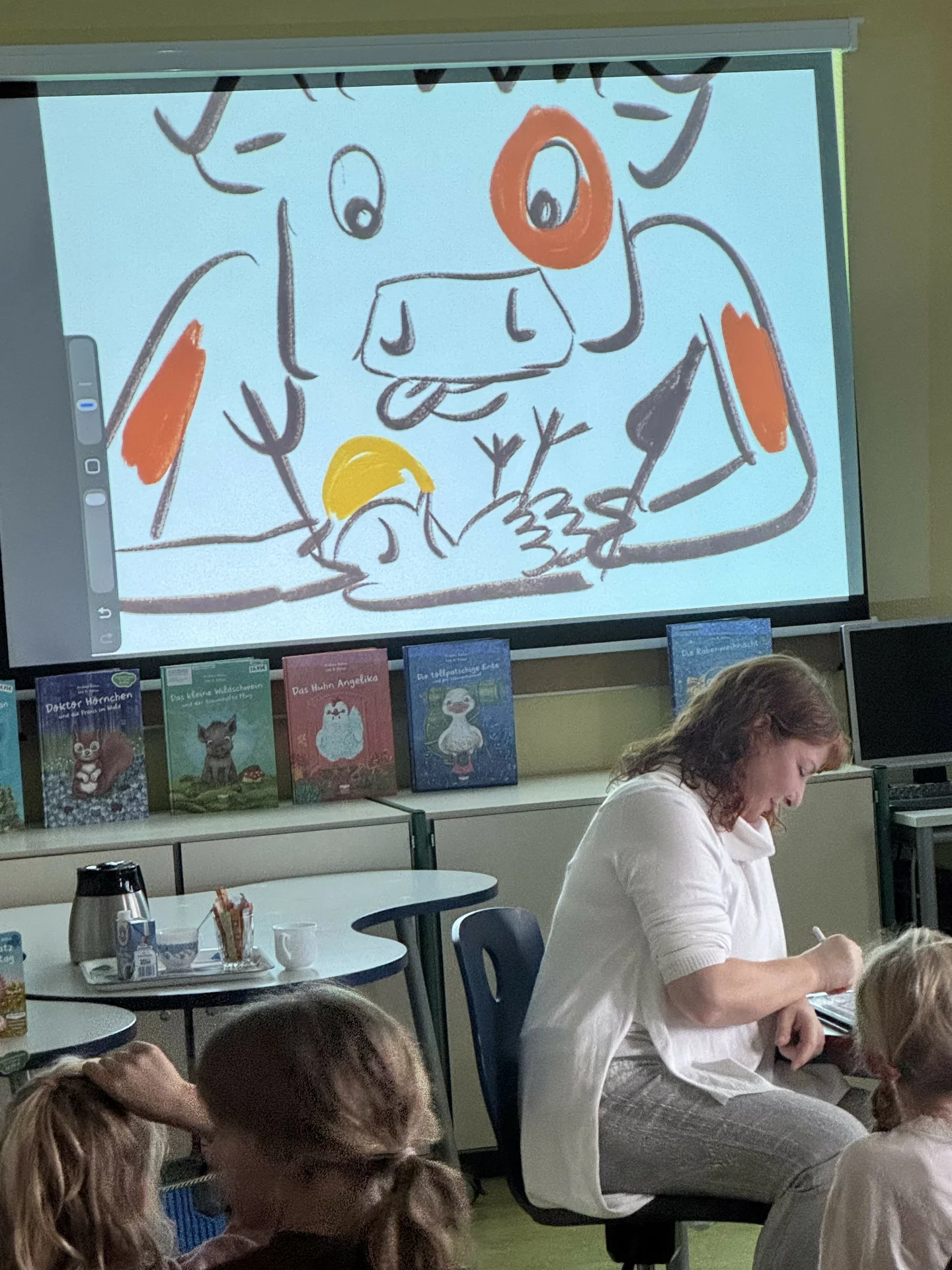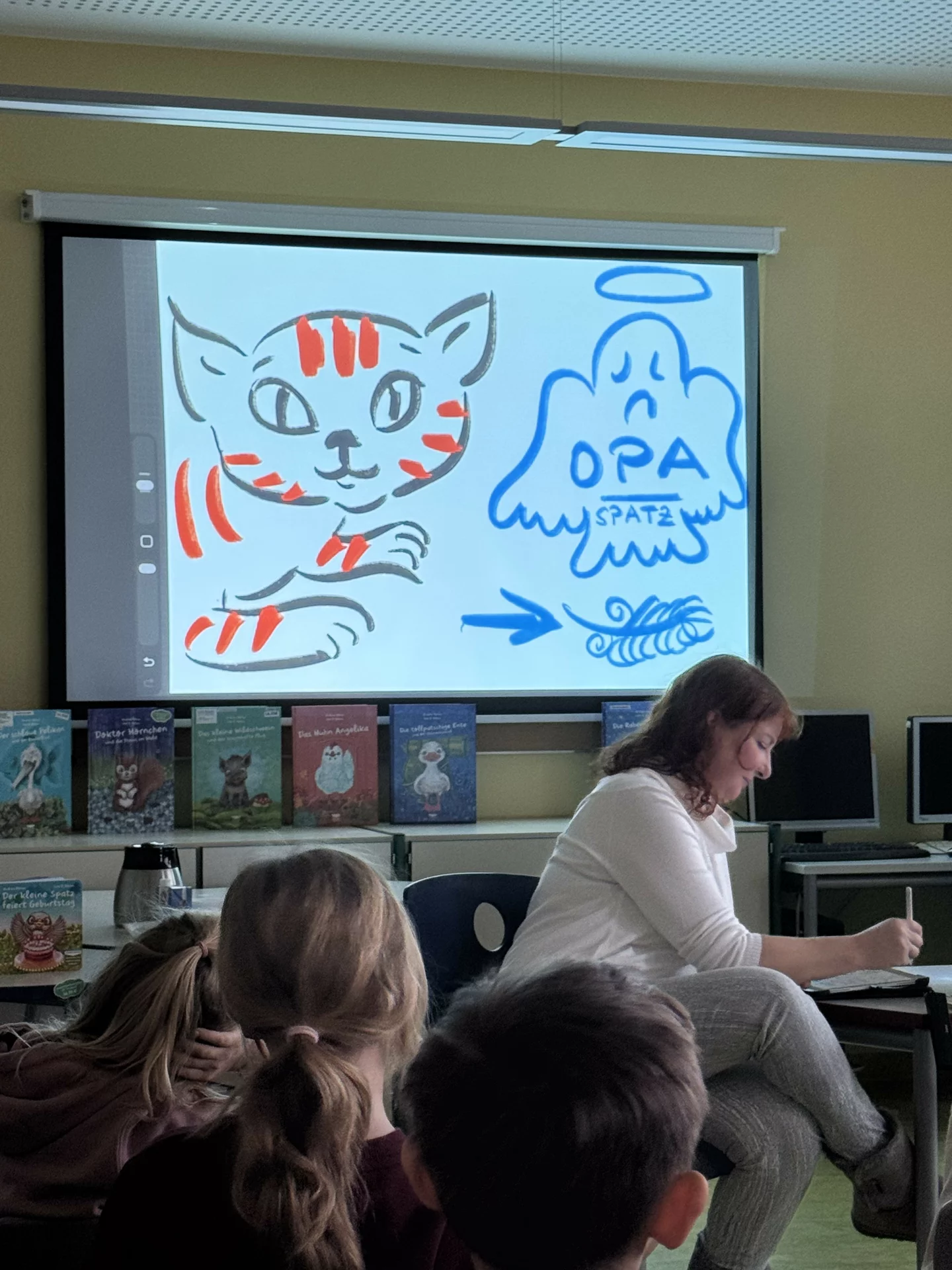 Schon zu Beginn der Lesung herrschte gespannte Aufmerksamkeit – und das aus gutem Grund. Während Frau Böhm aus dem Buch vorlas, entstand gleichzeitig auf einer großen Leinwand eine Live-Zeichnungen zur Geschichte. Die Kinder konnten Schritt für Schritt verfolgen, wie der kleine Spatz und seine Welt gezeichnet wurden. Dieses Zusammenspiel aus Vorlesen und Zeichnen machte die Veranstaltung zu einem besonders lebendigen Erlebnis.