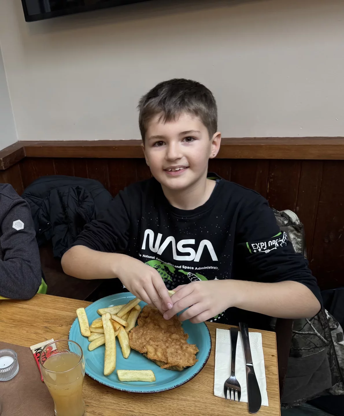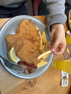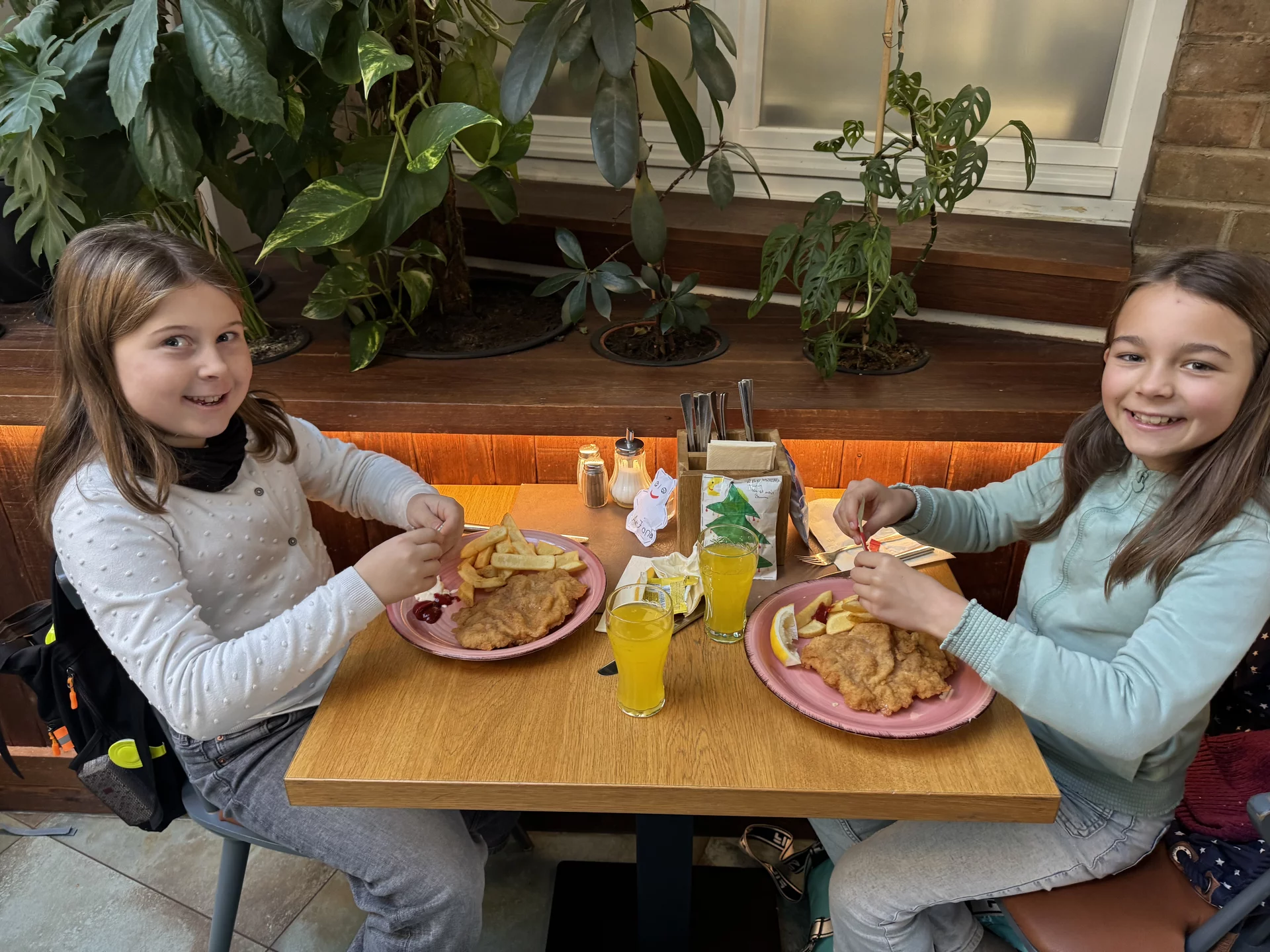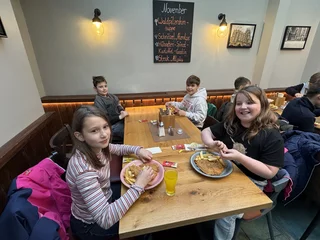 Nach so vielen Eindrücken wurde es Zeit für eine Stärkung. Die Klasse machte sich auf den Weg zum Restaurant „Schnitzler“ am Domplatz. Dort wurden die Kinder herzlich empfangen. Auf die Teller kamen Riesenschnitzel mit selbstgemachten Pommes – ein echtes Highlight – sowie ein Getränk nach Wahl. Alle ließen es sich sichtlich schmecken.