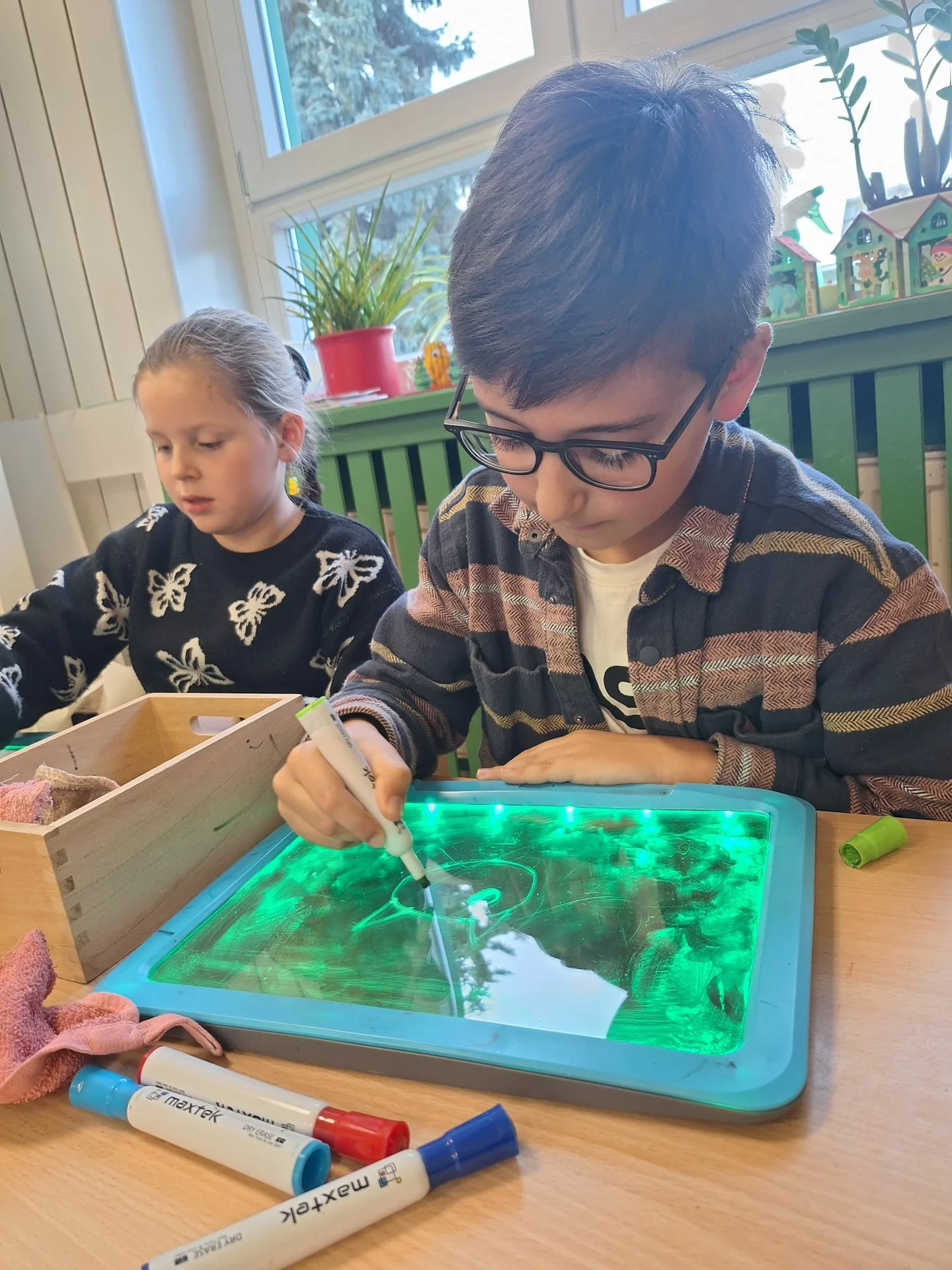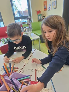 an anderen Stationen Faschingsmasken und Girlanden bastelten.