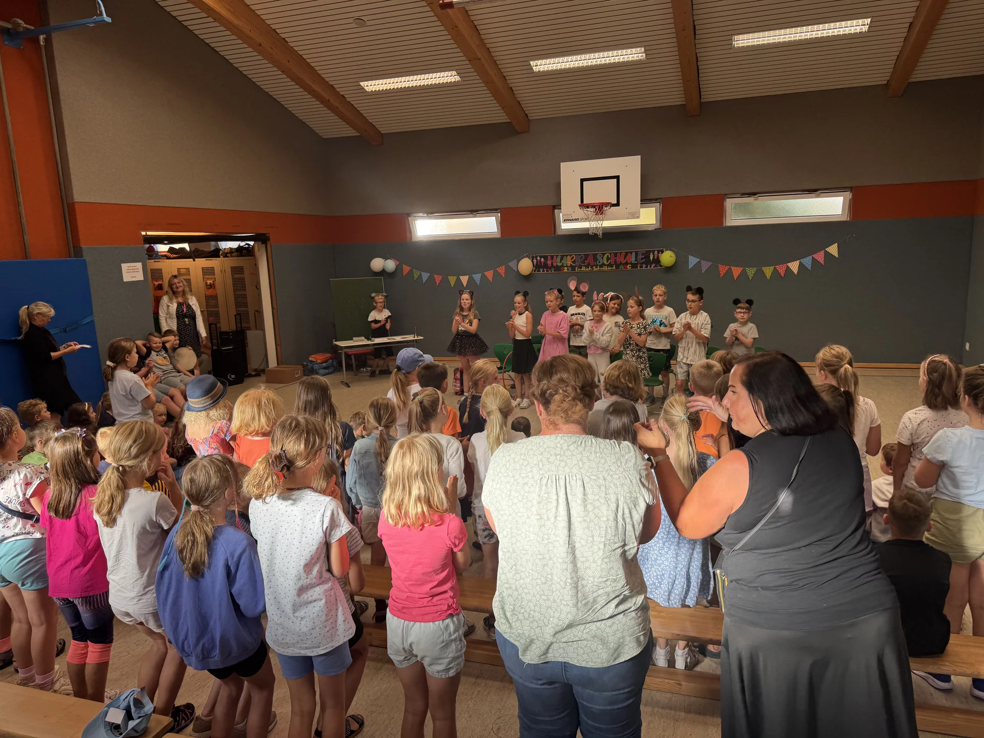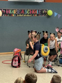 Alle Schülerinnen und Schüler versammelten sich in der Turnhalle, wo die Klasse 4a ihr einstudiertes Programmstück „Tierschule“ präsentierte. Eine tolle Leistung, die mit großem Applaus vom gesamten Publikum bedacht wurde.