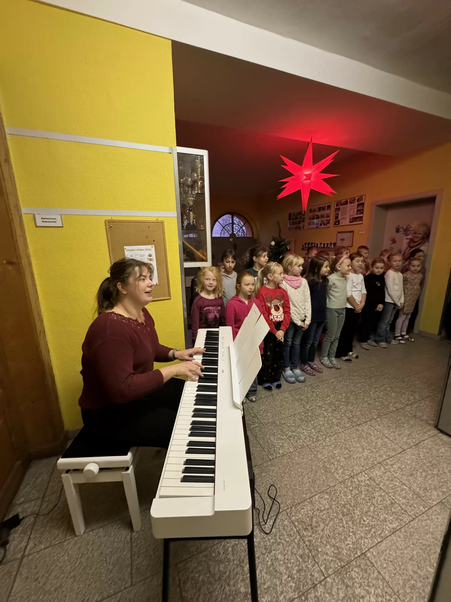 Jede Woche übernimmt ein anderer Jahrgang die Gestaltung des Programms für die ganze Schule. Mit viel Engagement und Freude haben die Kinder gemeinsam mit Frau Georgy im Musikunterricht verschiedene Musikstücke eingeübt. Auf dem Programm stehen dabei immer ein modernes sowie ein traditionelles Weihnachtslied, ergänzt durch ein passendes Weihnachtsgedicht. So ist für Abwechslung gesorgt und gleichzeitig können alle – Schülerinnen und Schüler, Lehrkräfte, Erzieherinnen, Schulbegleitung, der Hausmeister und unsere Sekretärin – gemeinsam mitsingen.